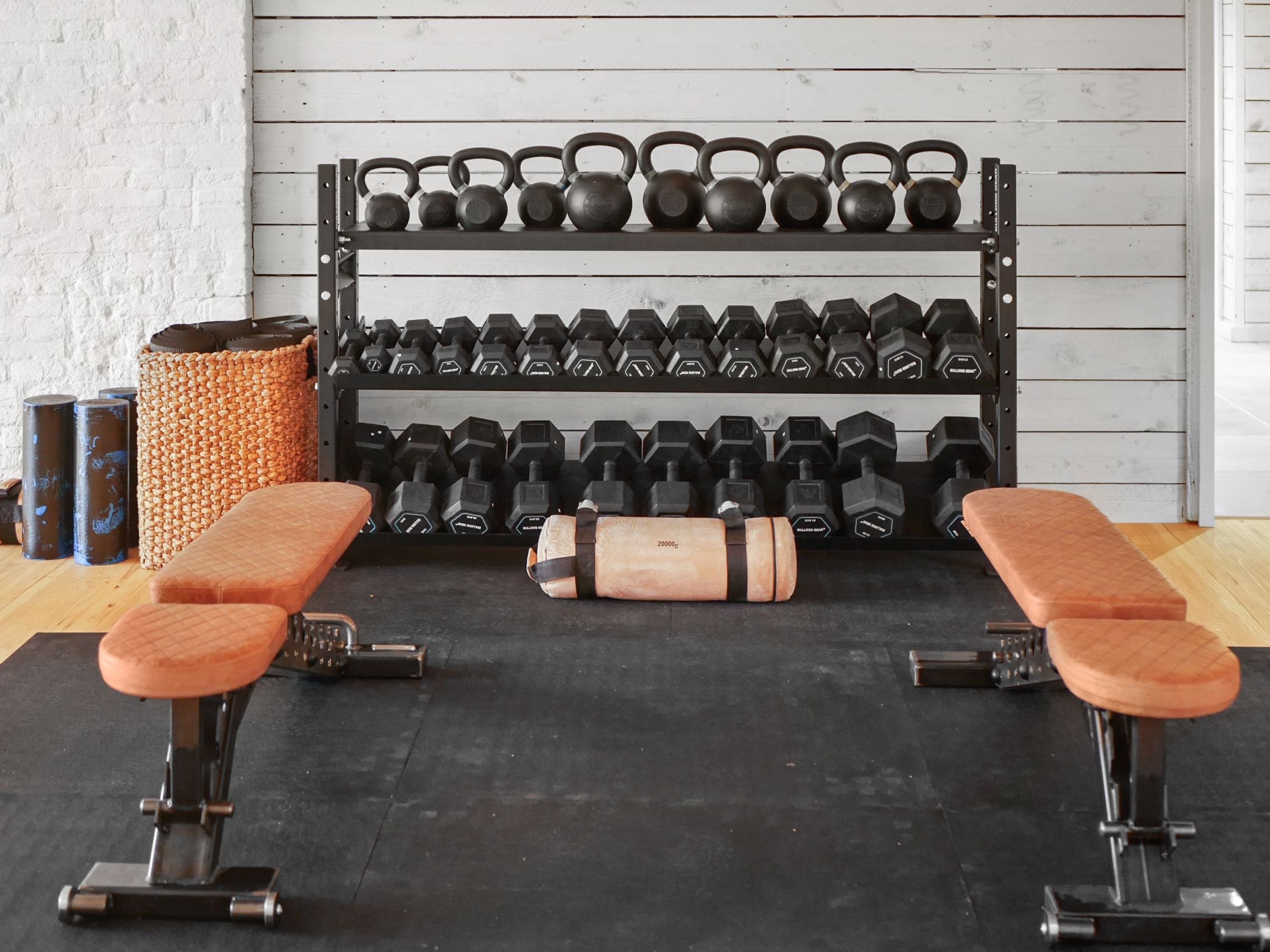Environmentally friendly gym flooring, just like yoga studio and indoor basketball court flooring, represents one of the most important material selections to get right. We opt for recycled rubber tiles or planks with a vinyl layer on top.